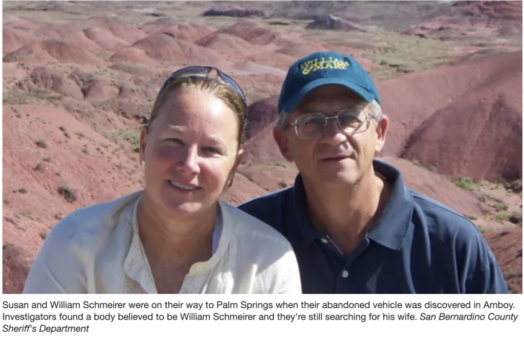 Susan Schmeirer, 65, and her husband, William, 64, of Williamsburg, Virginia, went missing after a visit to Amboy Crater during a cross-country trip to see a daughter in California. They were due to arrive at Palm Springs on June 2, 2018. Surveillance footage showed the couple was at the crater’s visitor center off National Trails Highway in Amboy, a desert community about 50 miles north of Twentynine Palms and 100 miles from Palm Springs. Their empty car was found at the trailhead for Amboy Crater on June 13, 2018, about 10 days after they were reported missing.