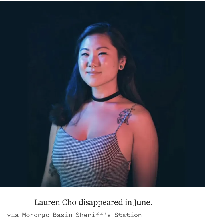 Lauren Cho, a 30-year old visual artist from New Jersey fondly called “El”, went mysteriously missing in Yucca Valley after walking away from her rented Airbnb in the late afternoon with only the clothes on her back on June 28, 2021. Friends and family figured she had walked off into the desert hills. Local news station KESQ reported she vanished without a trace.