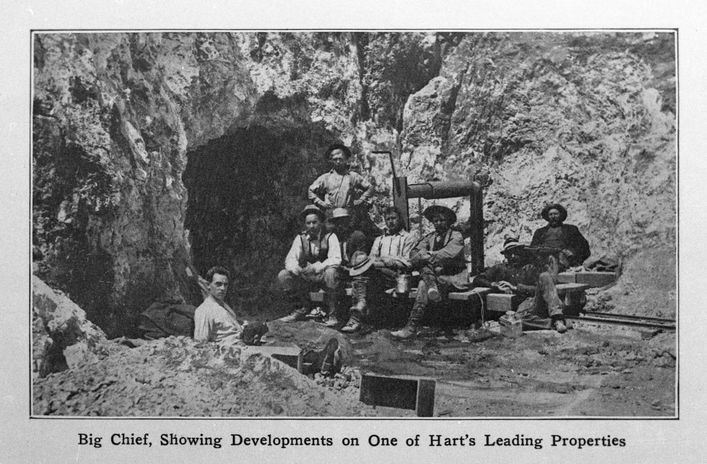 During the next few months, 700 people arrived and progress in all its varied forms followed. By the Spring of 1908, Hart was a bustling mining camp. Its population doubled and then some.