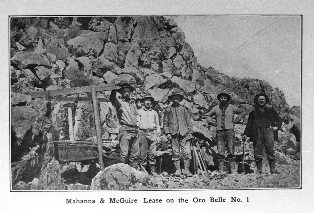 During the Panic of 1907, a financial crash that began with a severe drop on the New York Stock Exchange, James Hart and the brothers Bert and Clark Hitt, discovered pockets of rich gold ore in rhyolite on a steep slope in the Castle Mountains, approximately 4 miles south of the 23-miles long Barnwell & Searchlight Railroad. Their strikes became the Oro Belle Mine.