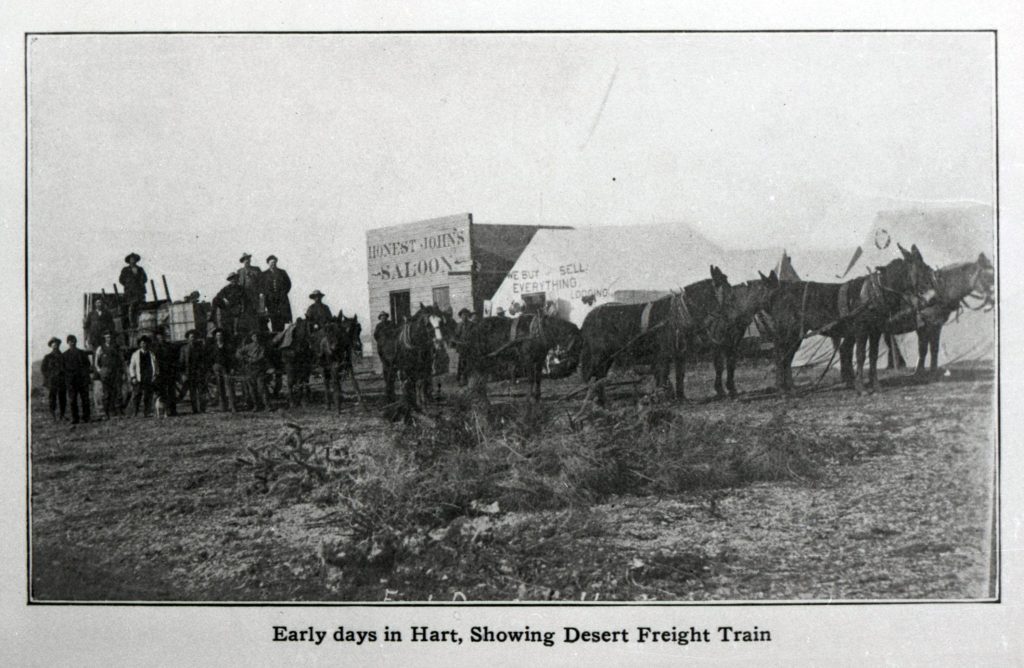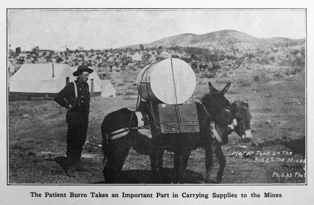 In January 1908, eager prospectors from Needles and Searchlight stampeded to the strike on Ford Model T’s, buggies, bicycles and burros, ready to strike it rich. Tents sprang up overnight. Burros hauled water to Hart for $8 dollars a barrel.