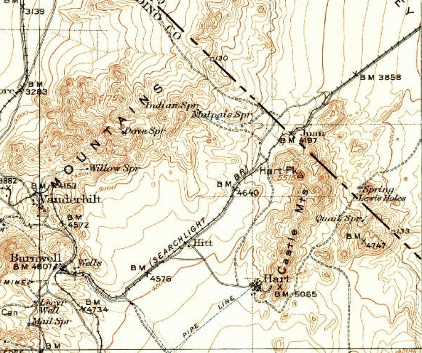 Actually, according to Abandoned Settlements of the Eastern Mojave, George A. Foster, a young broker from Goldfield, acquired several claims above the Oro Belle Mine. He named the trio the Big Chief. M.L. Cook was hired by Foster as a surveyor. Cook named the townsite below the mines after James Hart.