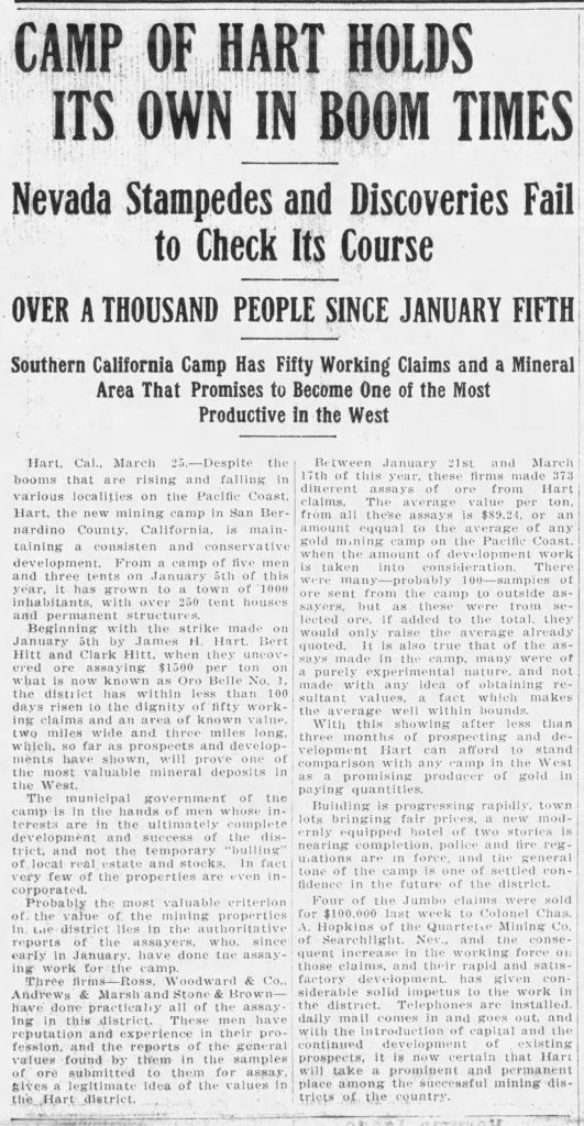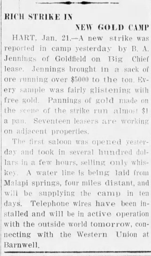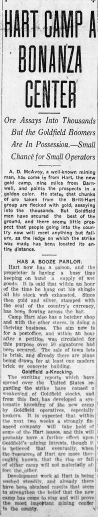 James Hart must’ve won the game of Rock, Paper, Scissors because the town bore his name. The strike was touted as the “Second Goldfield bonanza.”
