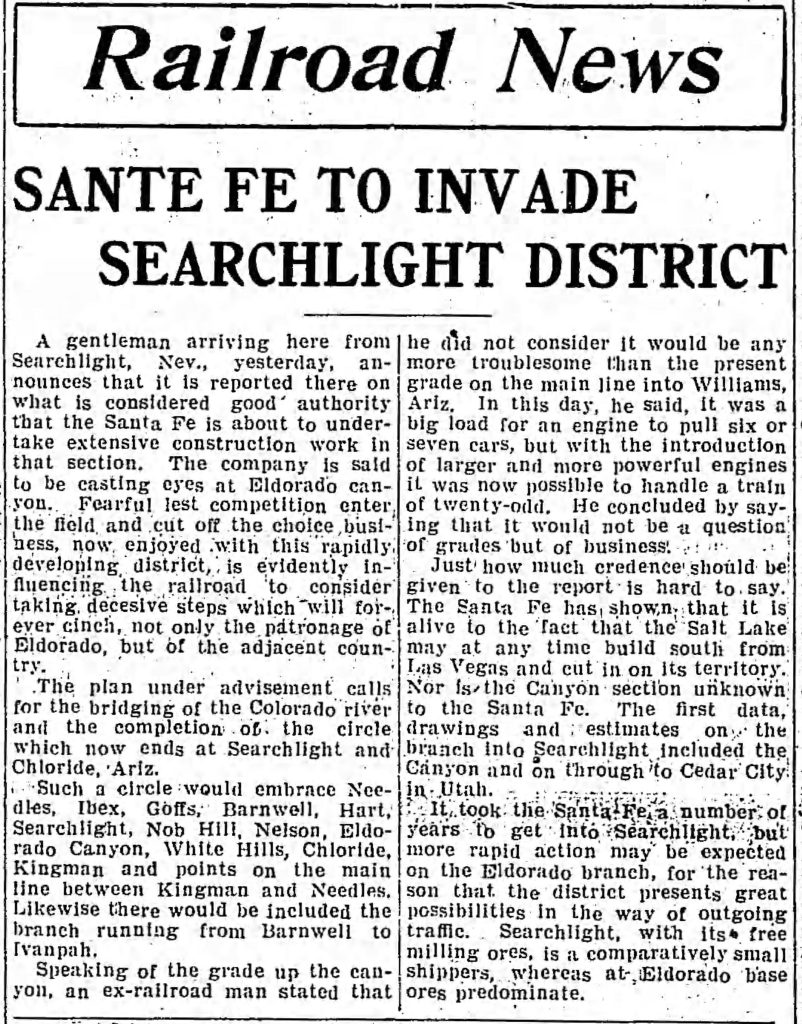 The Barnwell & Searchlight railway was built as an extension of the Santa Fe‘s network in the Mojave Desert, which included the California Eastern Railway that reached Barnwell, formerly Manvel.