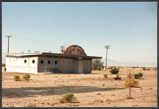 “Expressway Diner on pre-1973 Route 66 between Cadiz and Amboy, CA. June 1989. The Diner, known as the Roadrunner was dressed up for a Dodge commercial.” Photo by Evans, R. Sean. Courtesy Northern Arizona University.